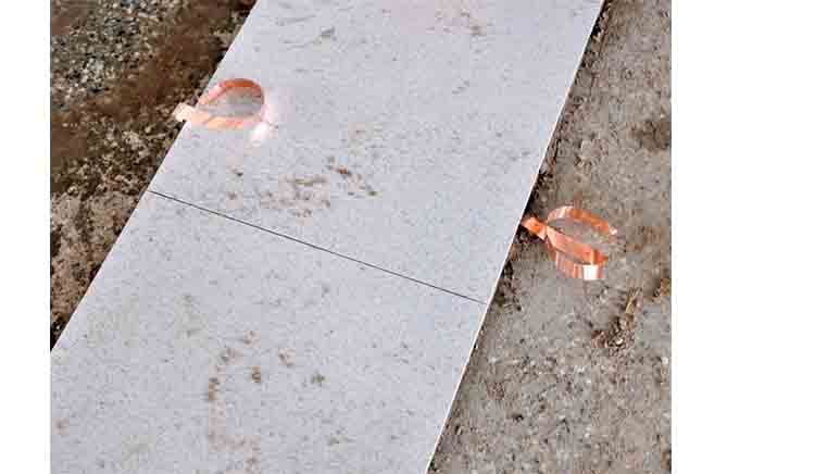 4、在水泥砂浆结合层上铺设导电铜带,纵向间距应采用3000㎜,横向间距应采用4800㎜。铺设完成后,应采用万用表检测导电铜带使其全部形成通路,并做好隐蔽工程验收记录。